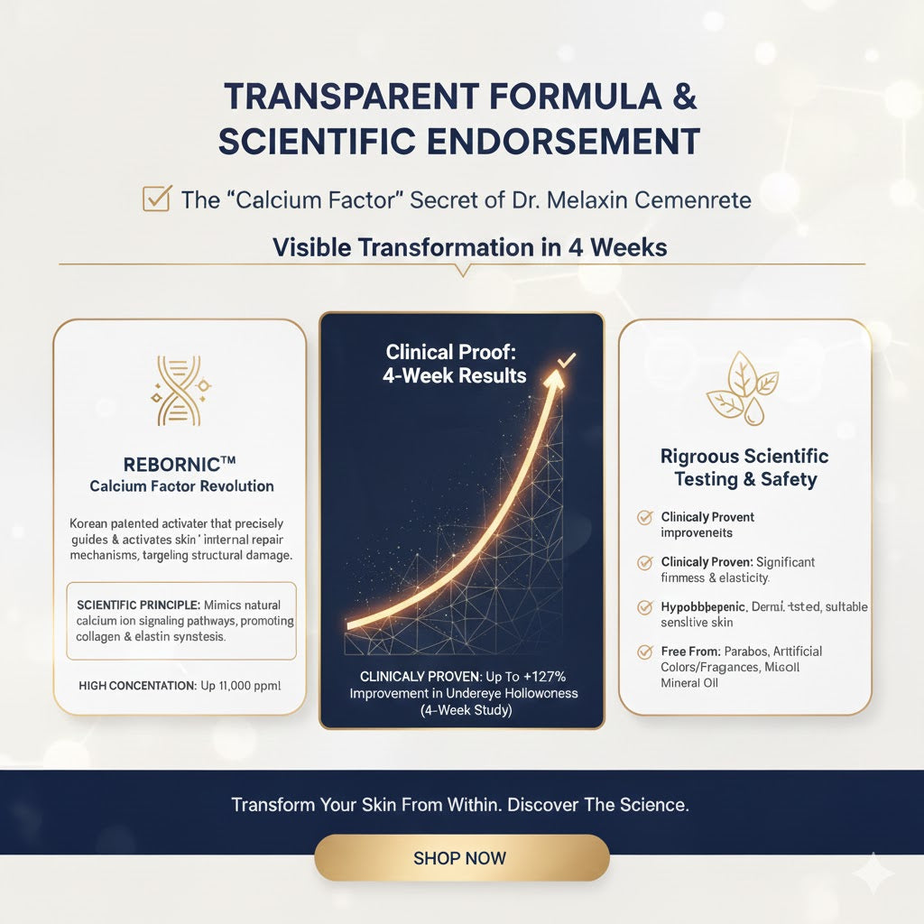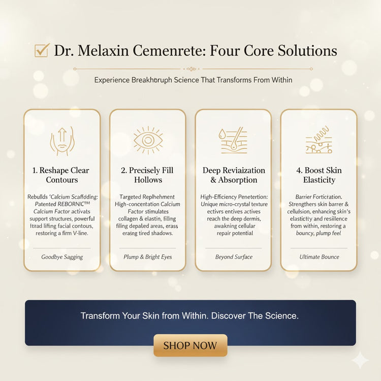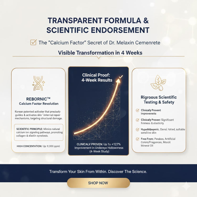 Our core is the patented REBORNIC™ "Calcium Factor" technology, which goes beyond surface hydration to activate cellular repair and rebuild skin structure from within.