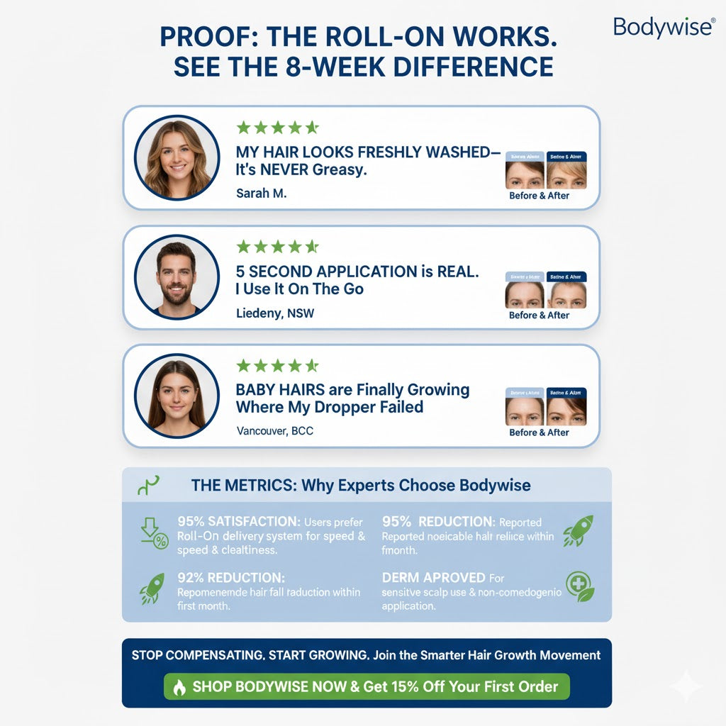 A: Absolutely not. Our lightweight, water-based formula is fast-absorbing (within 30 seconds). The precise roll-on application ensures zero residue and no impact on styling.