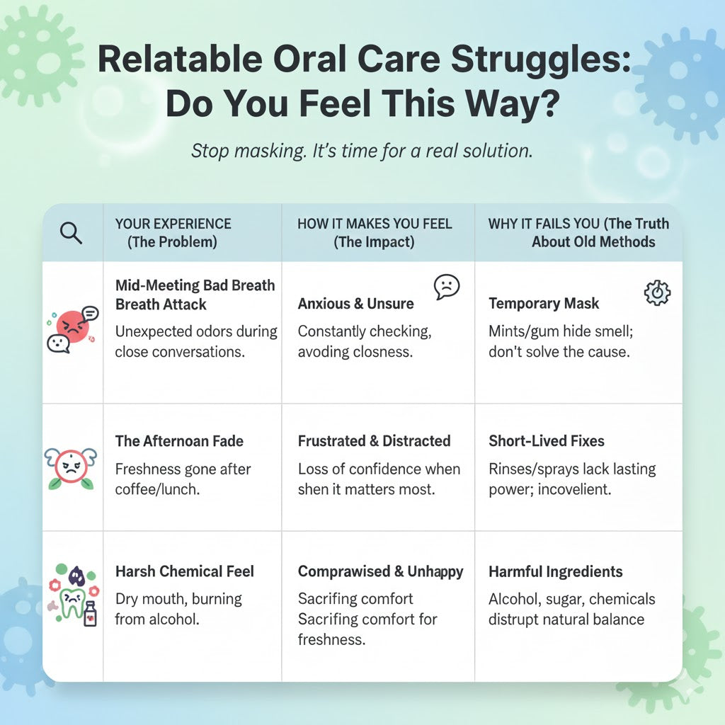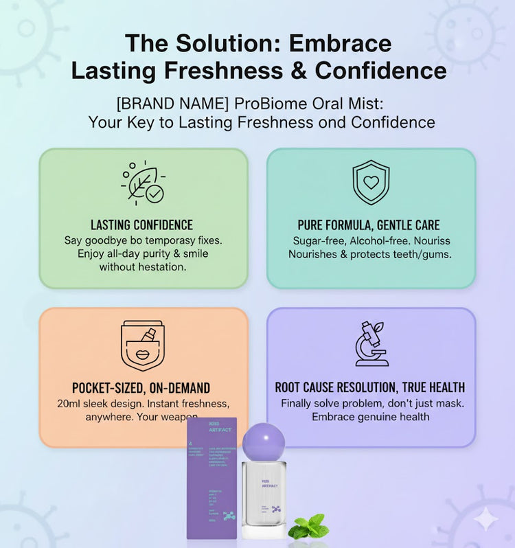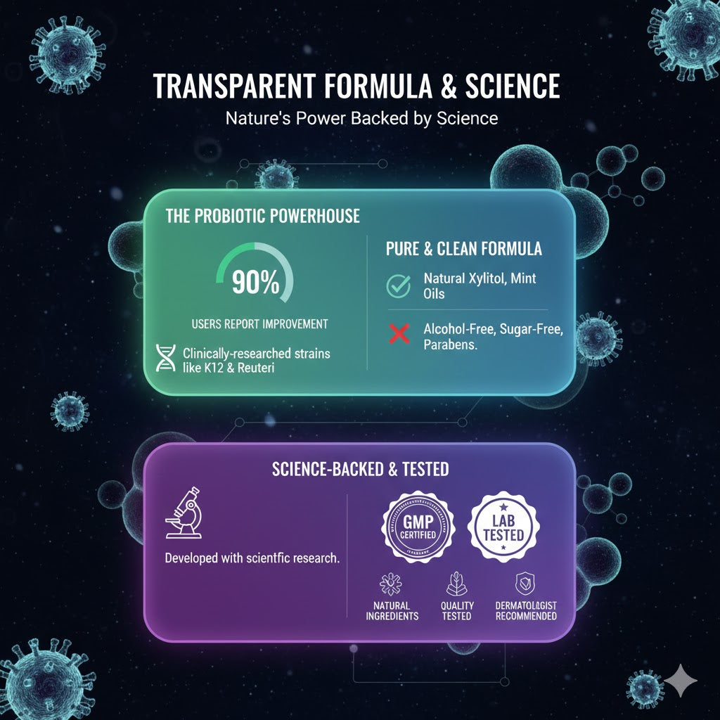 Our probiotic formula offers instant freshness and rebalances oral flora at the source. Consistent use significantly improves oral health, combating recurring bad breath for a lasting fresh feel. It works by balancing, not "curing."